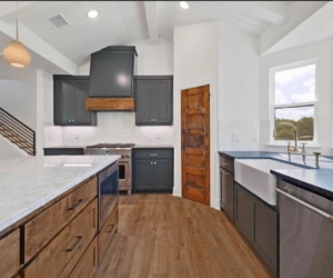 Custom granite and quartz countertops in modern Craftsman-style kitchen